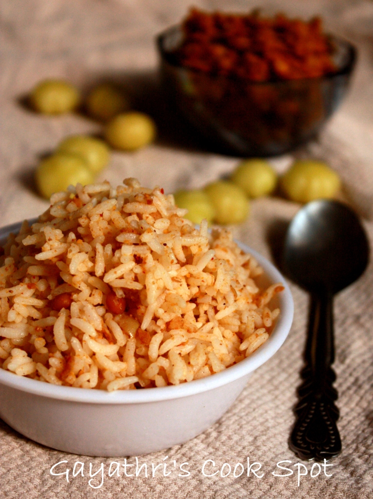 Last week I visited my mom and stayed there for 4 days. An aunt who lives there in Coimbatore came to meet my mom. When she came she brought with her a lot of arinellikkai / gooseberry taken from the tree which she grows. This kind of gooseberry is hard to see in super market or stores. I see it rarely in the supermarket nearby but they look very bad and I don't buy it. But this gooseberry which aunt brought were green and plump and I just couldn't take my eyes off it. They were looking so beautiful. We decided to make pickle with half the quantity and remaining went into this delicious and tangy rice. The gooseberries are cleaned, washed and dried with towel. The gooseberry is chopped into thin slices and the seed is removed. After slicing the gooseberries, a spice powder is prepared and is used along with the gooseberries to prepare thokku. This thokku can be refrigerated for a week. You can add this thokku to cooked rice and you get the flavourful nellikkai saadam. I used to love this saadam and mom used to make it often when I was carrying Sruti. There was a tree in that house and I used to get this rice whenever I wanted. So when SIL prepared this it took me back 6 years.