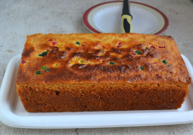 This cake has been in my draft folder for so long. When I saw this recipe at Srivalli's Blog during the A-Z Blogging Marathon, I book marked it and made it for the next month's Cooking From Other Blog theme. But as I opted out of that Blogging Marathon, this has been lying in my drafts since then. The texture came out very different from Srivalli's cake but it tasted very delicious. The orange flavour was so strong and the tutti frutti added a nice colour and crunch to the cake. I served it topped with the caramel syrup. Never forget to mix the tutti frutti with flour, otherwise all the tutti frutti will sink to the bottom of the cake.
